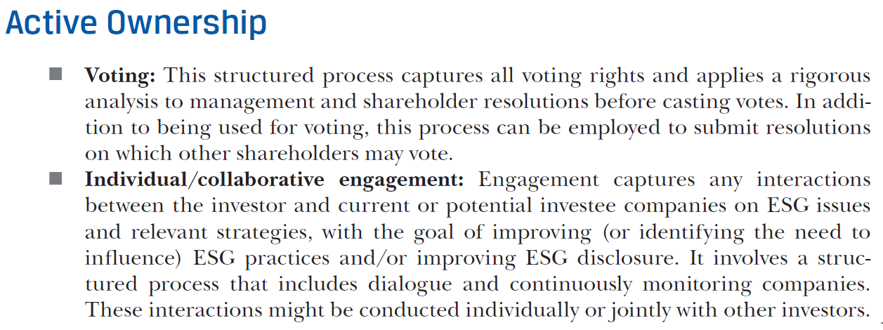 Through engagement (also known as active ownership or stewardship), investors can use their position as partial owners of companies to improve how those companies are managing or disclosing ESG performance.