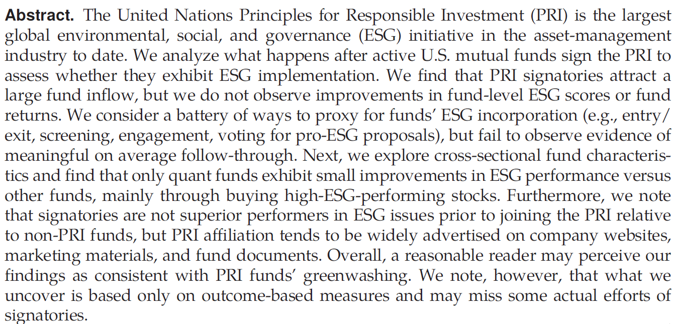 It is the most influential organization devoted to the advancement of ESG investing globally (Matos 2020).