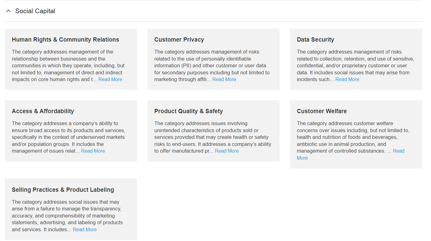 Social Capital. This dimension addresses a company’s impact on external stakeholders and the management of those stakeholder relationships, including a company’s license to operate. External stakeholders include customers, local communities, regulators, and the public.