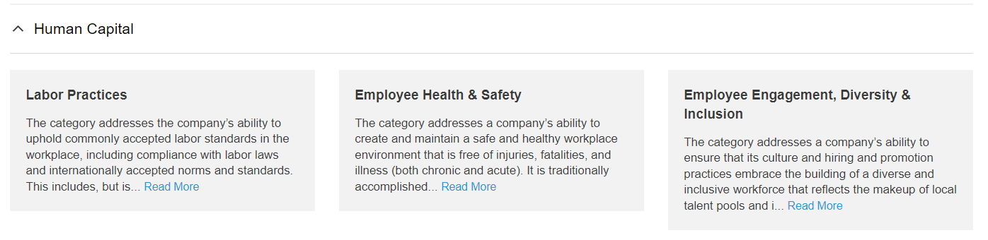Human Capital. This dimension addresses issues that affect a company’s workforce, which is often a key resource to delivering long-term value.