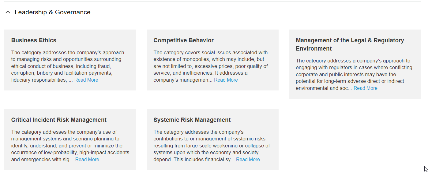 Leadership and Governance. This dimension involves the governance and management of key industry issues that may create conflicts with the interests of broader stakeholder groups, and therefore may lead to liabilities or impacts on a license to operate.